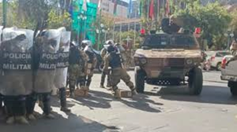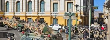 Tropas militares y tanquetas se desplegaron este miércoles frente a la sede del gobierno boliviano en La Paz e intentaron tumbar una puerta del palacio presidencial, e implementaron un dispositivo para tomarse el palacio. Según la televisión boliviana, el oficial ingresó por unos momentos al edificio antes de salir caminando.