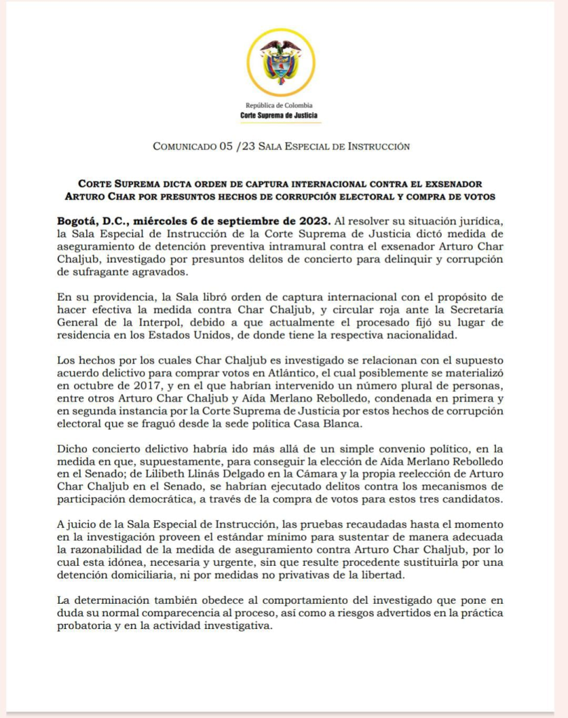 Al resolver su situación jurídica, la Sala Especial de Instrucción de la Corte Suprema de Justicia dictó medida de aseguramiento de detención preventiva intramural contra el exsenador Arturo Char Chaljub, investigado por presuntos delitos de concierto para delinquir y corrupción de sufragante agravados.