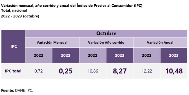 Por el lado de la inflación año corrido, se expuso que entre enero y octubre a de 2023 la variación del IPC Total fu se explicó principalmente por la variación anual de las divisiones alojamiento, mismo periodo del año anterior, cuando fue de 10,86%”