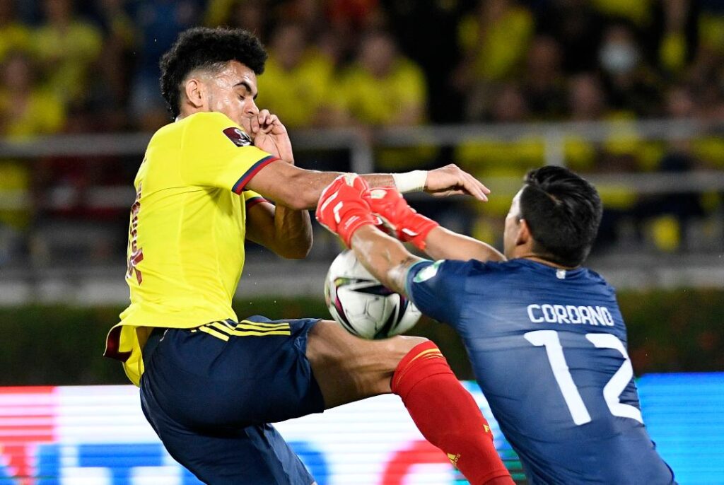 Al minuto 39, por fin, el salvador de nuestros tiempos, el mejor jugador colombiano del momento, tras  un pase de Juan Guillermo Cuadrado ubicó al «Guajiro» Luis Díaz en el sector izquierdo, saca a su paso rivales, se perfila hacia el medio y saca un tremendo zurdazo al palo izquierdo del arquero boliviano, para romper el embrujo de 7 partidos sin anotar y marca la diferencia del 1 x o a favor de los nuestros. El descanso llegó con la tranquilidad del gol y la victoria parcial de Brasil sobre Chile, resultado favorable para las aspiraciones colombianas.