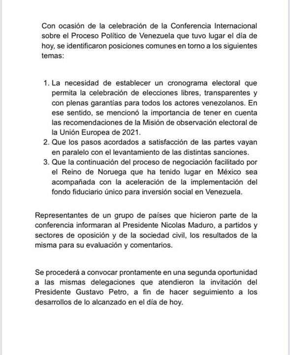 El Presidente Gustavo Petro instaló este martes en el Palacio de San Carlos la Conferencia Internacional sobre el Proceso Político en Venezuela, en la que hizo un férreo llamado para que América sea un espacio de democracia en la que el pueblo venezolano pueda decidir manera libre y sin presiones.