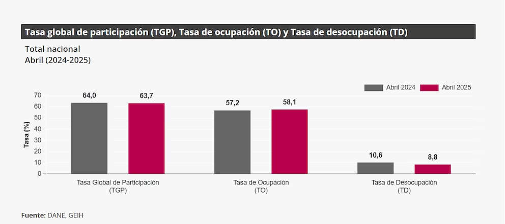 Según informó el Departamento Administrativo Nacional de Estadística (Dane), la tasa de desempleo se ubicó en el 8,8%, lo que representa una disminución de 1,8 puntos porcentuales en comparación con el mismo mes del año anterior.
