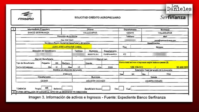 El viernes 22 de abril de 2024, Juan José Lafaurie Cabal acudió a una oficina de Serfinanza en el Cesar, departamento en el que su familia paterna ha sido propietaria de grandes extensiones de tierra, entre otras las haciendas Montecarmelo, El Porvenir y Guadalajara. Allí se presentó como un pequeño productor.