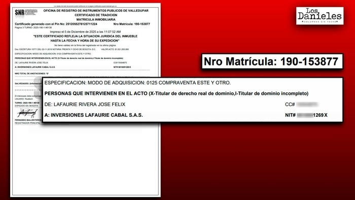 El dinero estaría destinado a la siembra de palma de aceite en el lote 3 de la Hacienda Guadalajara que, de acuerdo con la matrícula inmobiliaria, pertenece a Inversiones Lafaurie Cabal S.A.S. que le compró esa propiedad a José Félix Lafaurie.
