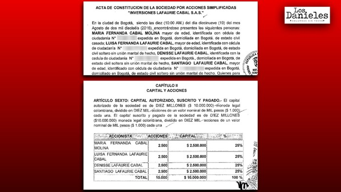 Los registros mercantiles muestran que los socios de esa empresa son: La senadora María Fernanda Cabal Molina, esposa de José Félix Lafaurie y candidata presidencial; y sus hijos Denisse, Luisa Fernanda y Santiago. Es decir los dueños de la tierra son la mamá y los hermanos del beneficiario del préstamo.