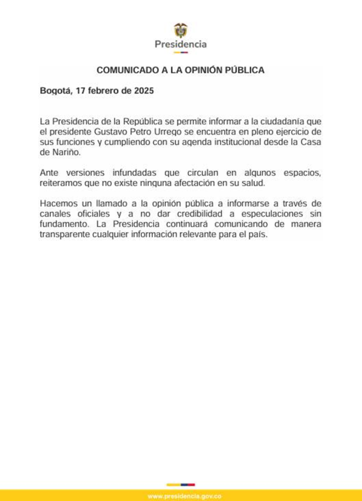 «Hacemos un llamado a la opinión pública a informarse a través de canales oficiales y a no dar credibilidad a especulaciones sin fundamento. La Presidencia continuará comunicando de manera transparente cualquier información relevante para el país», dice el comunicado de la presidencia.