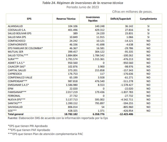 “La Superintendencia Nacional de Salud identificó que al corte de junio de 2023, 20 de las 24 entidades que actualmente operan el aseguramiento en salud, no cuentan con los recursos suficientes para cubrir la reserva técnica. El faltante histórico ha venido creciendo por falta de capitalización o fortalecimiento patrimonial hasta alcanzar $12.4 billones”, se lee en el archivo.