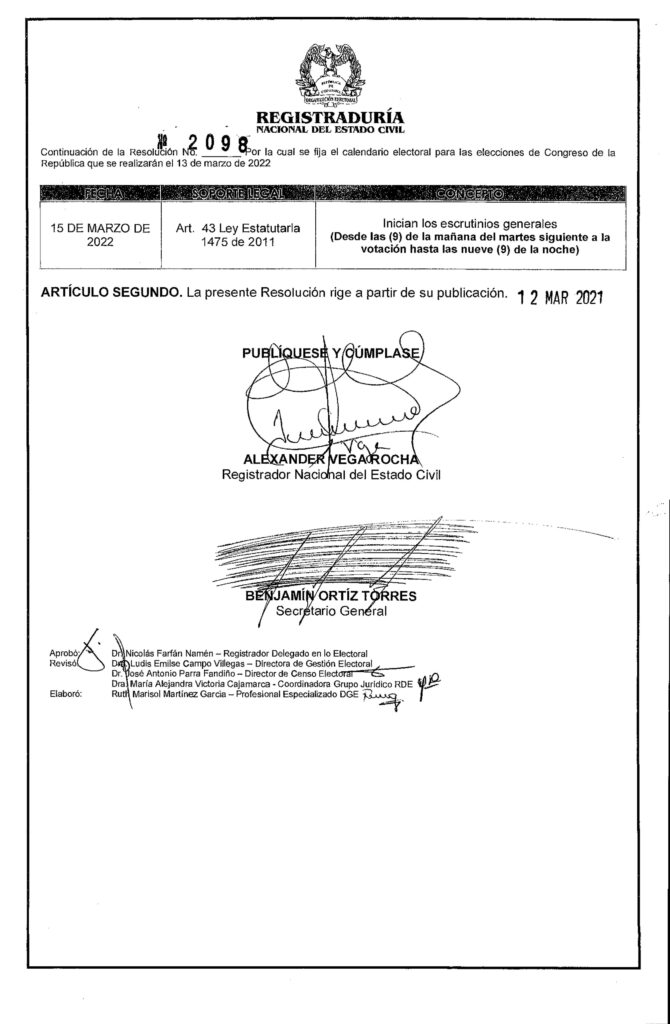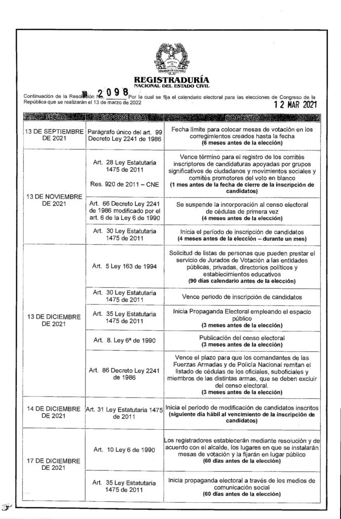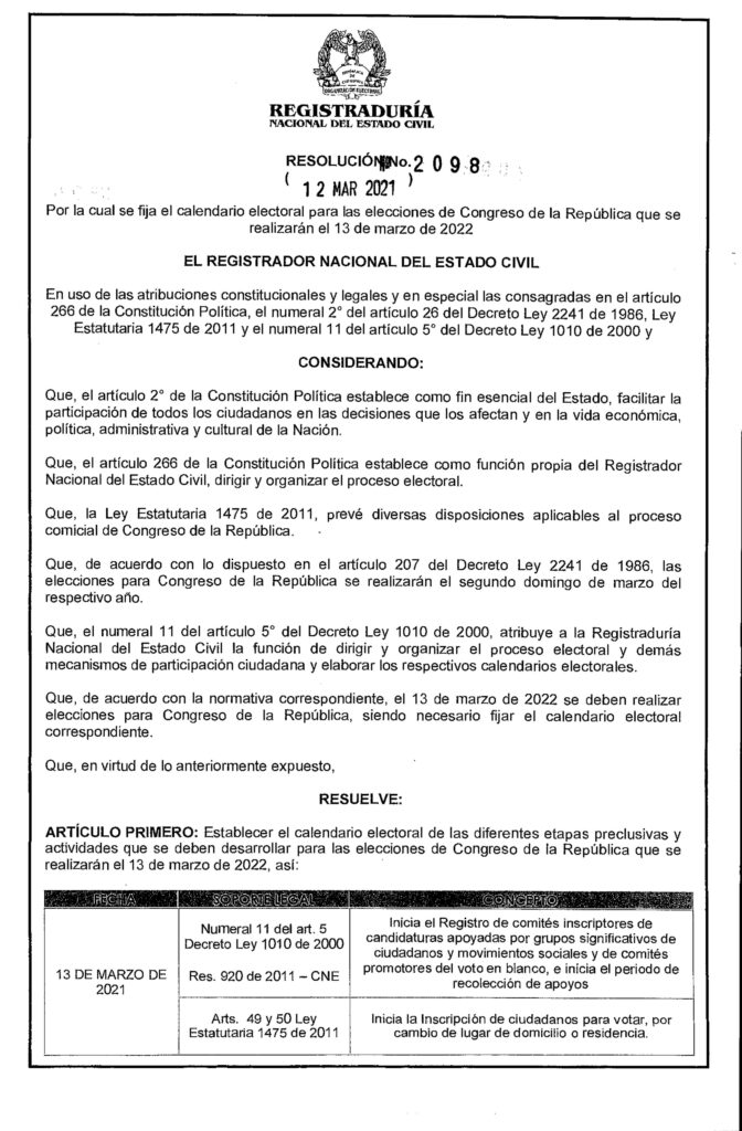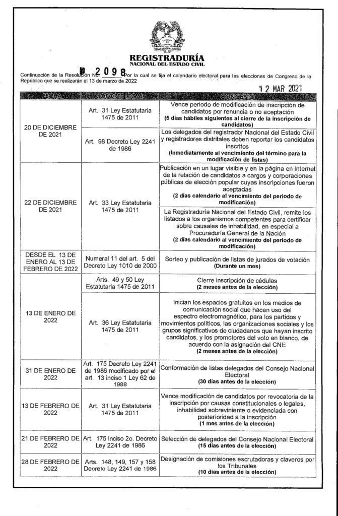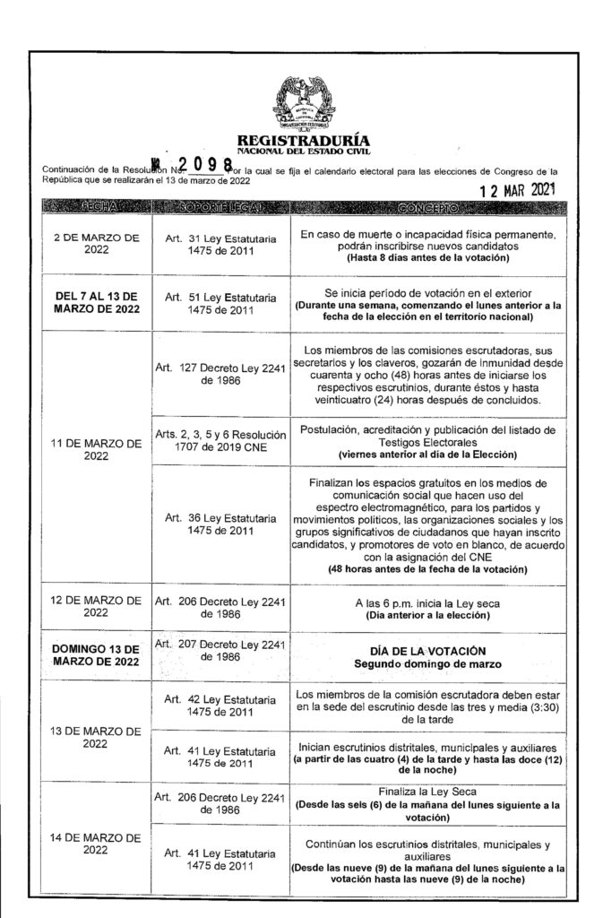 Listo el calendario electoral del congreso de Colombia 2022, Mediante la Resolución No. 2098 del 12 de marzo de 2021, la Registraduría Nacional del Estado Civil dio a conocer el calendario electoral oficial. Las elecciones para el congreso se realizarán el domingo 13 de marzo de 2022, en las cuales; se elegirán a los miembros de la cámara de representantes y los miembros del senado de la república.