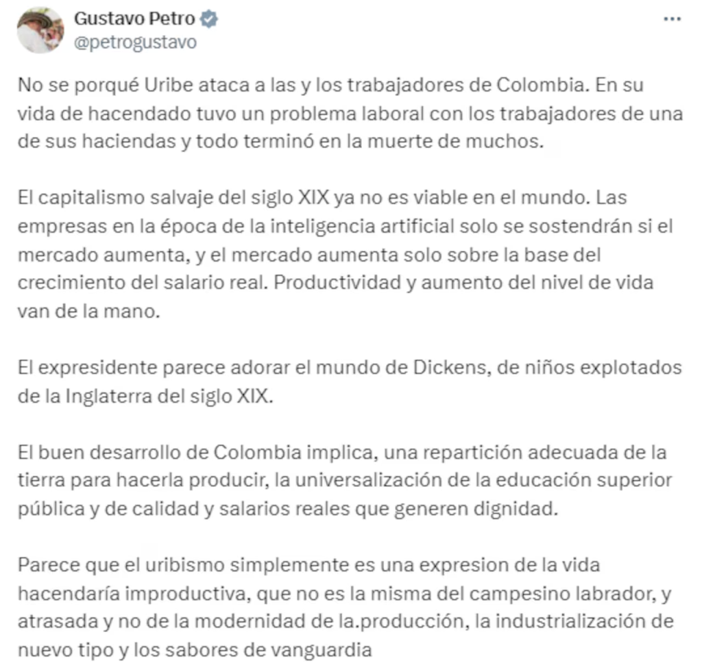 «Estimado expresidente, mientras sus trabajadores con hambre en el estómago le daban riquezas a usted, yo trataba se hacer una revolución para evitarlo. Hacer revoluciones no es delinquir, pero.matar revolucionarios por la espalda, a sangre fría y por simple odio, sí. En este mundo el hacendado que aún ve en sus trabajadores, esclavos negros, no tiene futuro. Lo invito a una revolución: la revolución de la equidad social y la democracia profunda. La revolución de la vida» aseguró el mandatario en su cuenta de X.