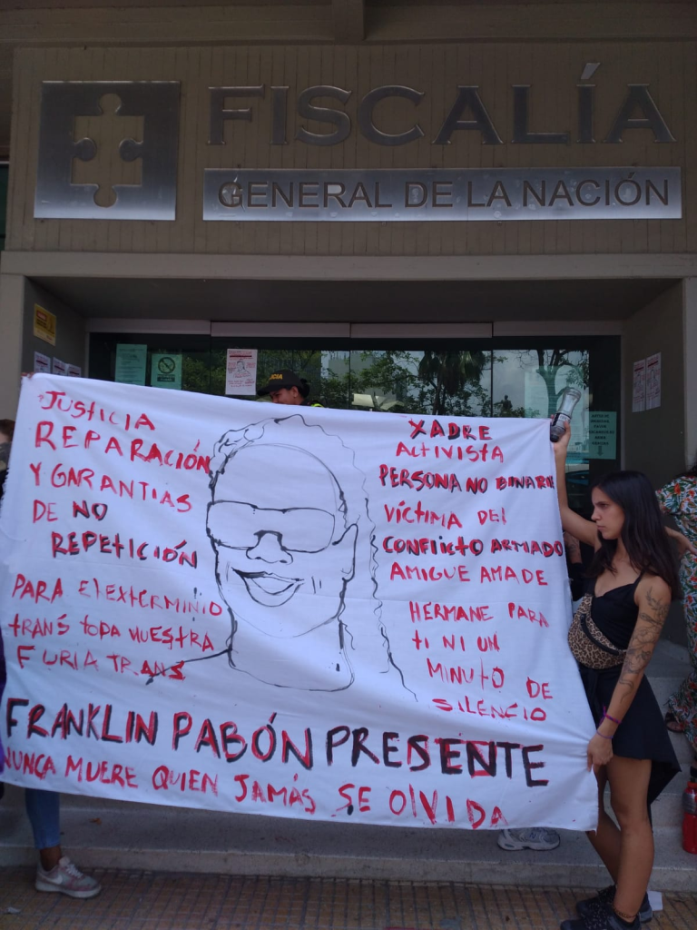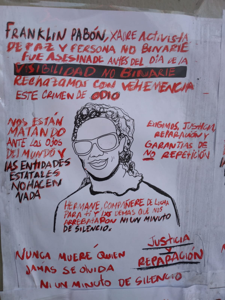 Según denunciaron los activistas Nico Rueda y Nijaidith Gaviría, presentes en el plantón, la muerte de la lider social y representante activa de la comunidad en el municipio de Malambo, Franklin Pabón, es otra víctima del conflicto armado y obedece al trabajo y liderazgo en la defensa de los derechos de la comunidad, precisamente, un dia antes de celebrar el dia de visibilidad no binaria.