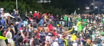 Al minuto 9 del segundo tiempo, quizás por la provocación del jugador verdolaga, fue el detonante que hizo que los hinchas junioristas apostados el tribuna norte-alta del estadio Atanasio Girardot arremetieran contra los de Nacional y estos, respondieran conviertiendo la fiesta del fútbol en un evento violento que deja varios heridos.