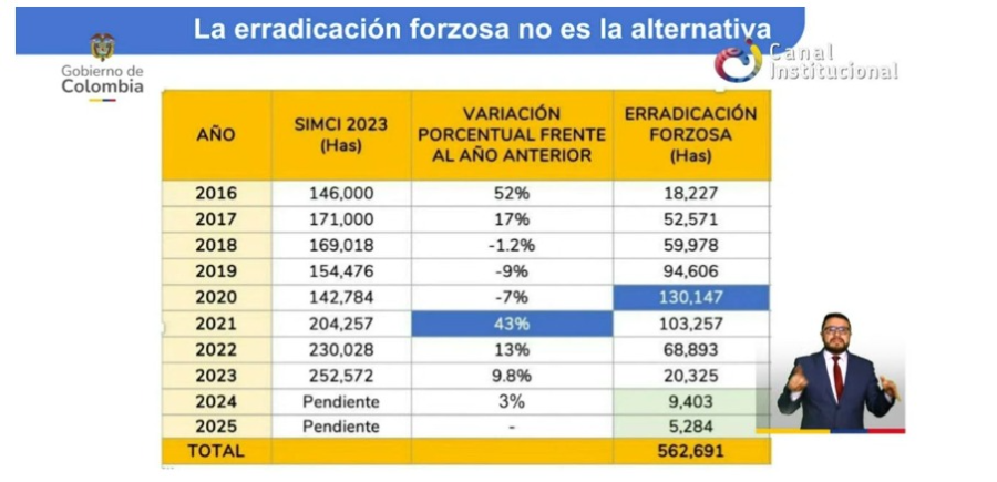 Comparó estas cifras con la erradicación forzada, que llegó a 130 mil hectáreas en 2020 sin reducir los cultivos, e incluso generó un repunte en 2021. Recordó que el único antecedente exitoso de sustitución fue el programa derivado del Acuerdo de Paz en 2018, con 38 mil hectáreas, desmantelado luego por el Gobierno Duque.
