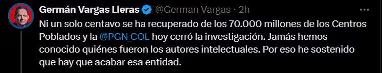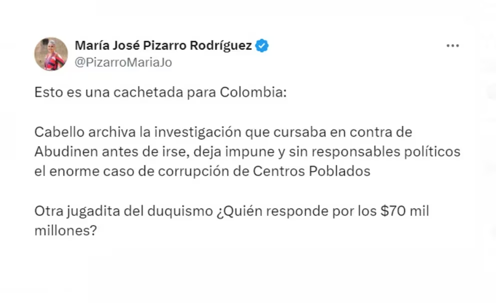 «Holis Margarita Cabello, óyeme tu si mandas huevo Margarita, a mi me inhabilitas por nueve años por haber suscrito un contrato que nunca se liquidó, no se terminó, no se pagó, no hubo ningún perjuicio, y me acabo de enterar que la Procuraduría acaba de archivar, siendo tu sinverguenza, acaban de archivar la investigación contra Karen Abudinen, la exministra de las TIC con los 70.000 millones de Centros Poblados, ahí si se entregaron 70.000 millones de pesos, y tu malandrina Margarita Cabello no vistes nada, carajo lo que es la política, tu si eres una arrastrada al servicio de los bandidos..»