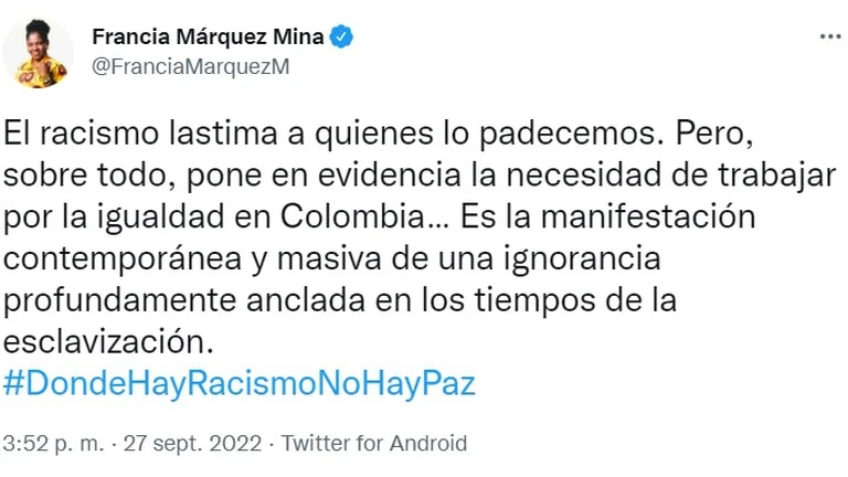 “El racismo lastima a quienes lo padecemos. Pero, sobre todo, pone en evidencia la necesidad de trabajar por la igualdad en Colombia… Es la manifestación contemporánea y masiva de una ignorancia profundamente anclada en los tiempos de la esclavización. #DondeHayRacismo No Hay Paz”