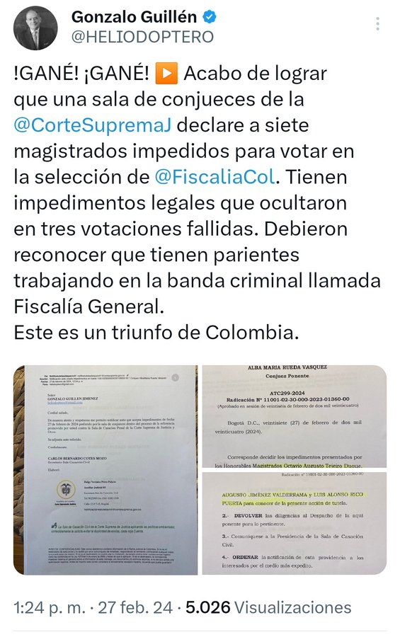 Gané, gané, fue el grito de júbilo del periodista Gonzalo Guillén, tras una revelación impactante, que los medios tradicionales tratan de ocultar. A través de su cuenta de X, el periodista Gonzalo Guillén asegura que logró por medio de una acción de tutela, que una sala de conjueces de la Corte Suprema de Justicia declare a siete magistrados impedidos para votar en la selección del próximo fiscal. Según Guillén, estos magistrados tienen impedimentos legales relacionados con parientes trabajando en la Fiscalía General, los cuales habían sido ocultados durante tres votaciones fallidas. Este acto legal, se percibe como un triunfo para la transparencia y la justicia en Colombiay deja en entredicho, el rol de la Corte Suprema de Justicia.