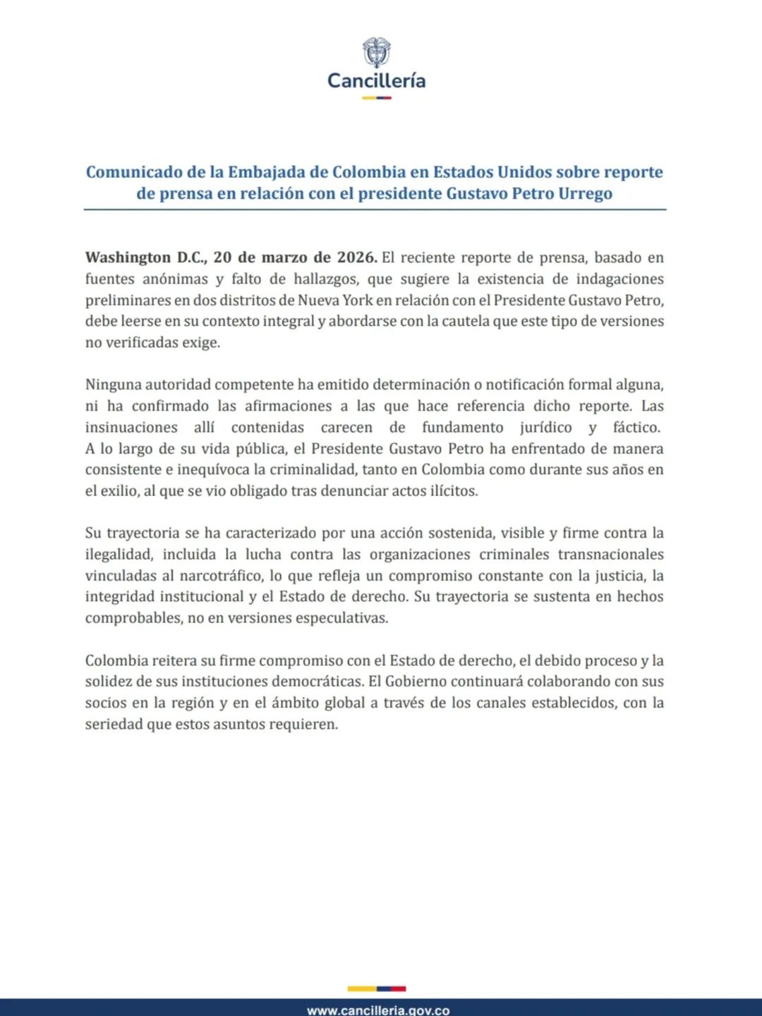 En horas de la tarde, en rechazo a la nota del New York Times, la Embajada de Colombia en Estados Unidos se pronunció mediante un comunicado oficial donde establece, que el reporte del diario debe abordarse con cautela porque, como se basa en información de fuentes anónimas, que no ofrecen una versión “verificada”.